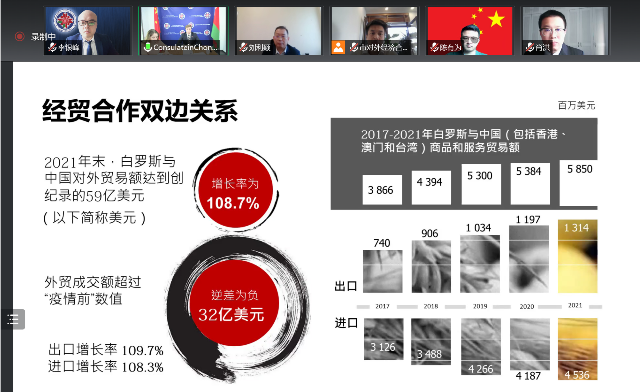 2022年11月25日,白罗斯驻重庆总领事馆与重庆市商务委对外投资和经济合作企业协会共同与重庆地区汽车、仪器仪表、智能照明技术、零部件制造等领域的大型工业企业高管举行了在线圆桌会议。